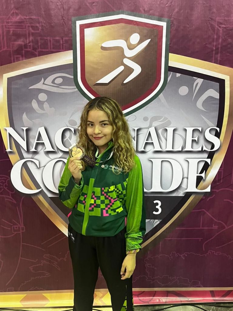 La atleta potosina, que tuvo sus combates en el centro de convenciones Tabasco 2000, participó en la categoría sub-21 menos de 46 kilogramos, logrando subirse al podio con la presea de bronce.