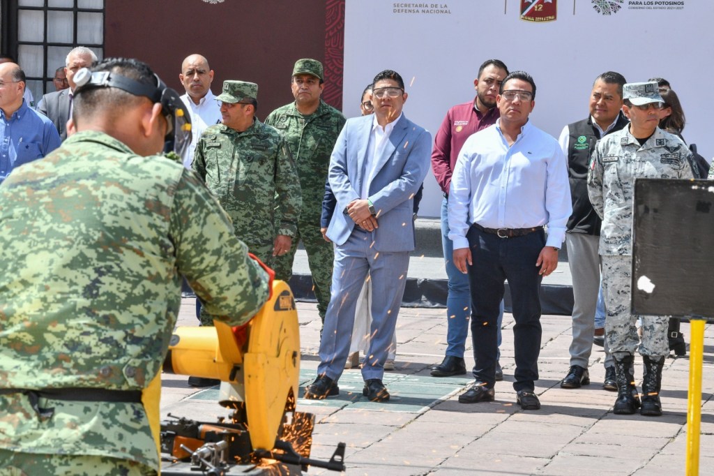 En las instalaciones de la XII zona militar, acompañado del General Mario Arturo Fuentes Guevara, Comandante de esta circunscripción, el Gobernador potosino atestiguó la inhabilitación de los artefactos largos y cortos incautados, donde destacó que este trabajo contribuye a reducir los índices delictivos, al tiempo de efectuar un reconocimiento al Ejército en las tareas de auxilio y protección diarias a la población, así como colaboración ante contingencias naturales.