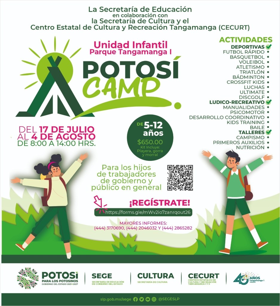 • Las Secretarías de Educación del Gobierno del Estado (SEGE), de Cultura (Secult) y parques Tangamanga, realizarán el “Campamento Potosí” para las y los niños de 5 a 12 años, del 17 de julio al 4 de agosto