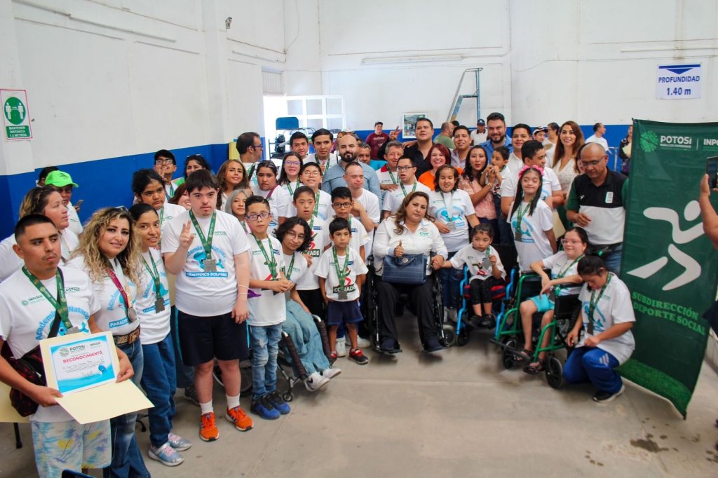 En ceremonia encabezada por el Director General del Instituto Potosino de Cultura Física y Deporte Jesús Joaquín García Martínez, acompañado por la Directora de Integración Social de Personas con Discapacidad del DIF Estatal, María de los Ángeles Frías Pérez, más de 60 alumnas y alumnos de la Academia Paralympics Dolphins de natación recibieron la constancia de cambio de nivel y medallas luego de concluir la semana de evaluación en la Alberca «Mariano Arista» del INPODE.