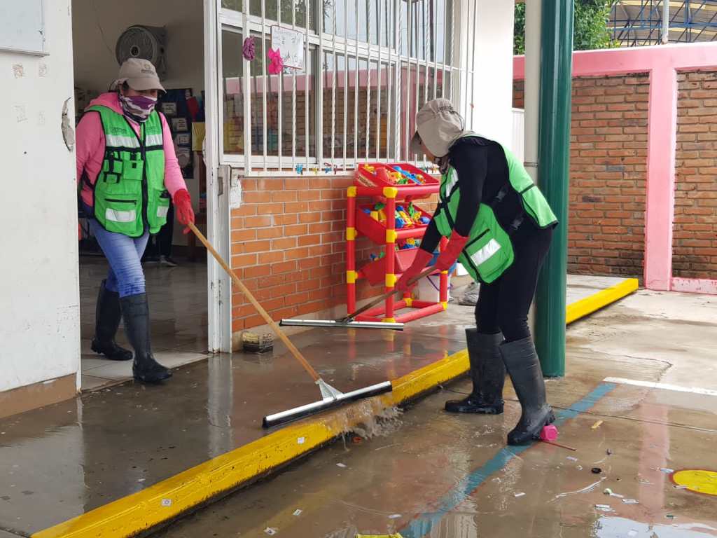 Asimismo, se realiza la limpieza de aljibes y sanitización, se brinda asesoría a las familias sobre medidas higiénicas y se extrae agua del interior de sus viviendas. También se trabaja en la limpieza en aulas, patio y áreas con agua a presión, barrido manual y recolección de basura del Jardín de Niños «María del Carmen Licona Hernández».