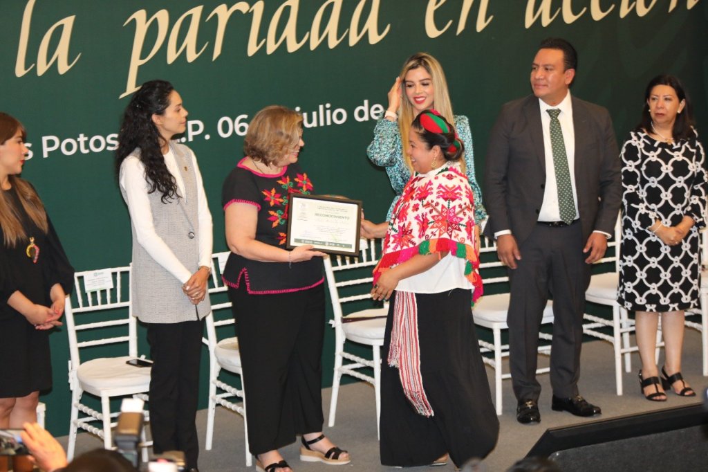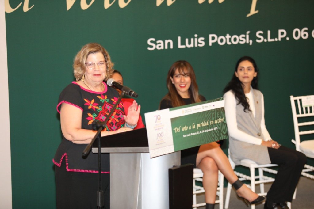 En el evento conmemorativo de 70 años del voto de las mujeres en México y 100 en el Estado, destacó la participación del Gobierno Estatal en este evento al otorgar reconocimientos a las primeras mujeres potosinas electas por medio del voto, quienes afirmó “contribuyeron en la construcción de un México libre e igualitario”.