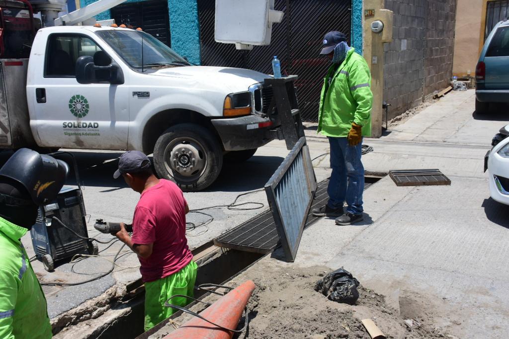 13 Julio 2023.- Derivado del apoyo a la seguridad vial y bienestar de automovilistas, ciclistas y peatones soledenses, y por indicación de la Alcaldesa, Leonor Noyola Cervantes, la Dirección de Servicios Municipales toma medidas para disminuir los riesgos asociados a las coladeras sin cubierta en diversas zonas, por lo que personal del área fabrica e instala rejillas faltantes, a pesar de ser responsabilidad del organismo intermunicipal INTERAPAS.