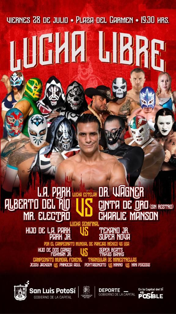 El Alcalde Enrique Galindo Ceballos anunció la presencia del histórico luchador potosino Alberto “El Patrón” del Río, en una función gratuita que se realizará el próximo viernes 28 de julio en la plaza de El Carmen. Alberto será acompañado por LA Park y Mr. Electro para enfrentarse con Dr. Wagner Jr, Cinta de Oro y Charlie Manson. En la lucha semifinal se encontrarán Hijo de LA Park y LA Pärk Jr, en contra de Texano Jr y Súper Nova. Esta función será gratuita para todos los aficionados potosinos que deseen asistir y forma parte del incentivo al deporte que el Gobierno de la Capital promueve para su ciudadanía.