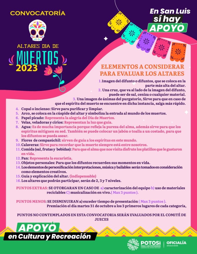 Las bases de la convocatoria incluyen: libertad de utilizar el material y recursos disponibles para la elaboración del altar, con características de las ofrendas básicas y el contenido de elementos y símbolos propios del altar, que inviten al espíritu a viajar desde el mundo de los muertos para que conviva ese día con sus deudos.