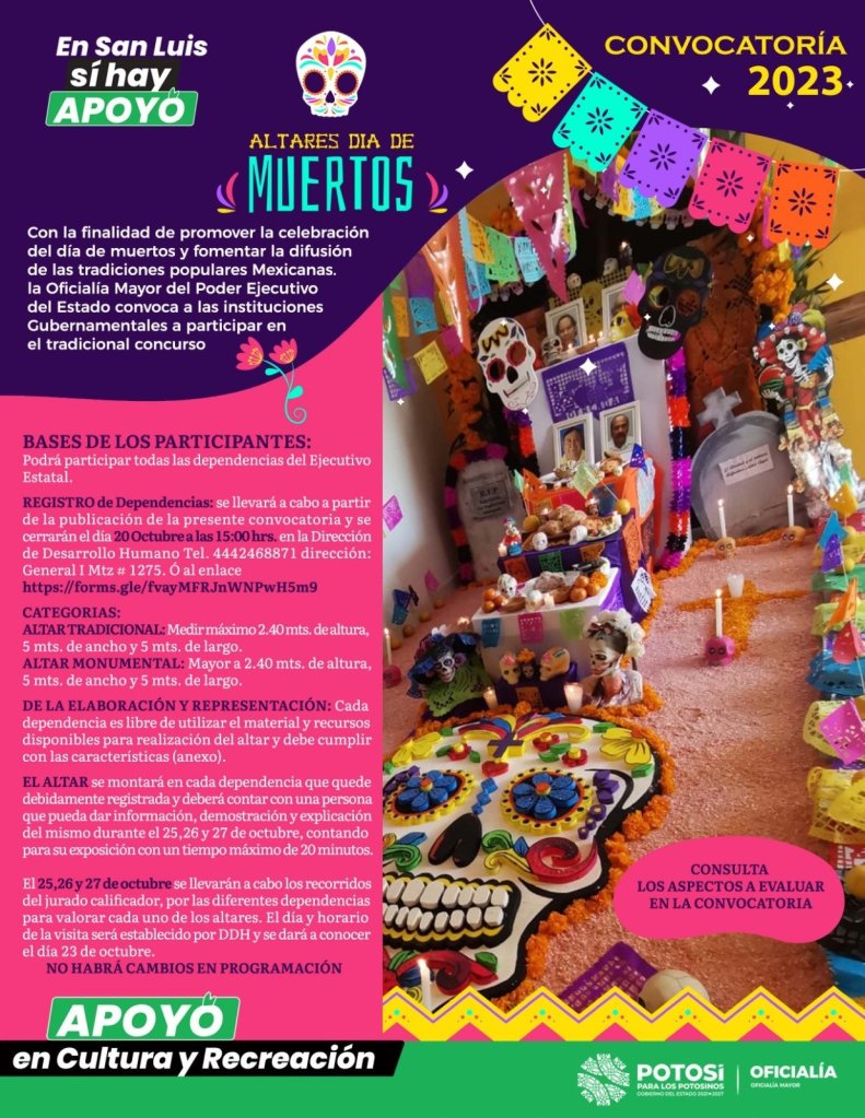 En apoyo al fomento y la preservación de las tradiciones potosinas y mexicanas, la Oficialía Mayor del Ejecutivo, lanzó la convocatoria dirigida a todas las dependencias de la Administración Pública Estatal para el concurso de elaboración del tradicional “Altar de Muertos”, con la meta de superar el número de las y los servidores públicos que participaron el año pasado a través de las 36 dependencias inscritas.