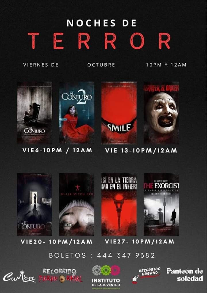 Como una propuesta única que promete una experiencia atractiva y escalofriante a las y los jóvenes, el Ayuntamiento de Soledad de Graciano Sánchez, a través del Instituto Municipal de la Juventud, invita a todas y todos a disfrutar de las “Noches de Terror”, actividades que se realizan en el marco de las celebraciones de Día de Muertos en el municipio.