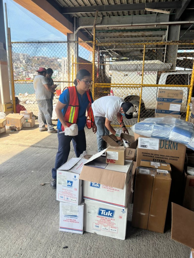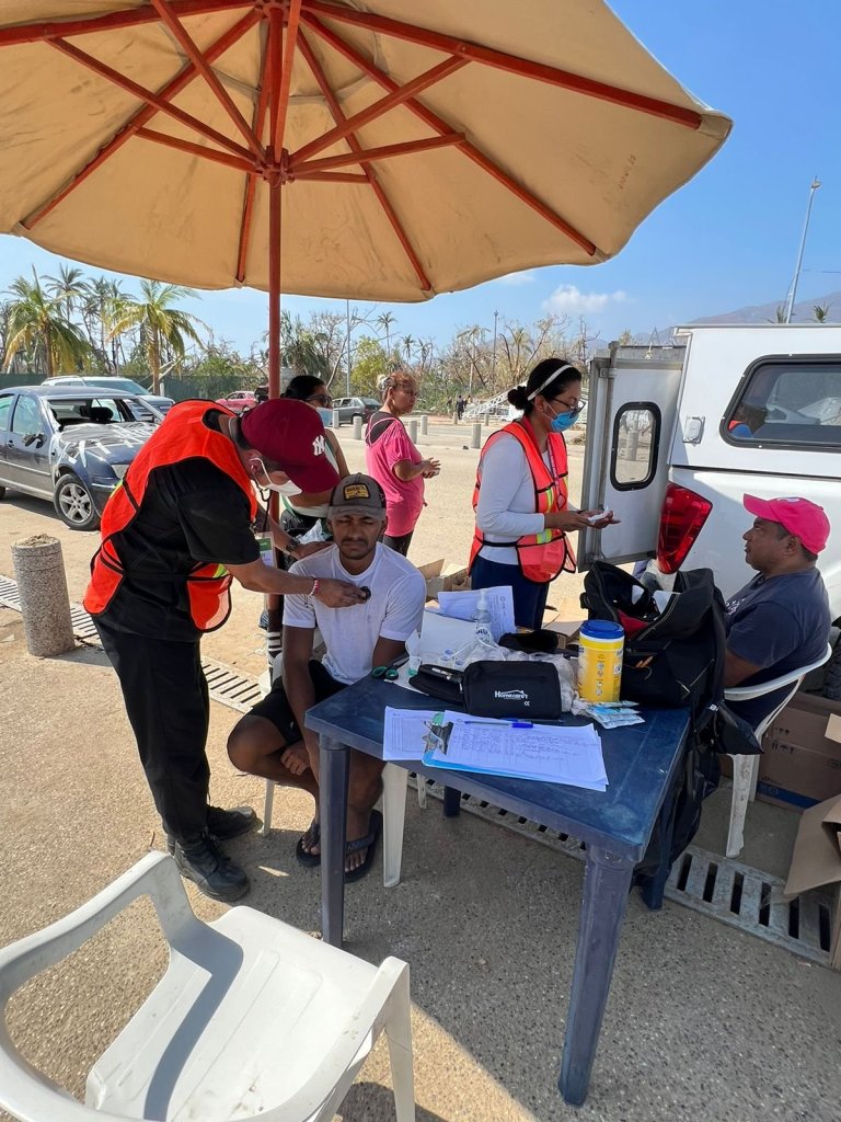 Durante dos días de acción en Acapulco, los cinco médicos, cinco enfermeras, dos paramédicos, tres personas promotoras de la Comisión Estatal para la Prevención Contra Riesgos Sanitarios (Coepris) y una de epidemiología, han apoyado a la población también al entregar alimentos no perecederos, insumos para aseo personal, así como plata coloidal y cloro, para prevenir riesgos sanitarios.