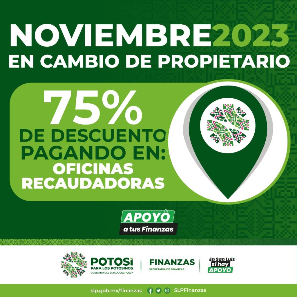 La Secretaría de Finanzas (Sefin), dio a conocer que durante noviembre se aplicarán descuentos en multas de control vehicular, así como en cambio de propietario, en apoyo a la economía de las familias potosinas y para que puedan acceder al programa de placas gratuitas que implementó el Gobierno del Estado.