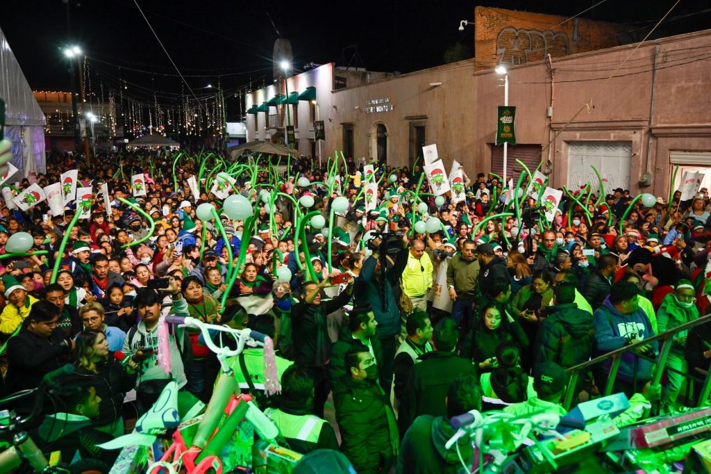 Junto a la alcaldesa Leonor Noyola Cervantes, diputados locales y federales, así como miembros de su gabinete, el Mandatario Estatal inició la repartición de juguetes para las y los más pequeñines, quienes ansiosos estiraban sus manos para ser los próximos en recibir su obsequio.