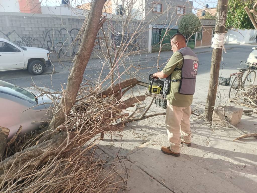 La Coordinación Municipal de Protección Civil Municipal de Soledad de Graciano Sánchez, en conjunto con diferentes áreas del Ayuntamiento, desplegó un integral operativo para atender incidencias ocasionadas por las fuertes ráfagas de viento que azotaron la localidad desde la noche del domingo hasta la noche del lunes, dejando un saldo de 16 reportes de árboles caídos atendidos.