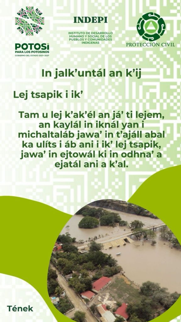 • La Coordinación Estatal de Protección Civil, elaborar trípticos informativos en las lenguas Tének, Náhuatl y Xi’iuy, en apoyo a las comunidades indígenas de San Luis Potosí
