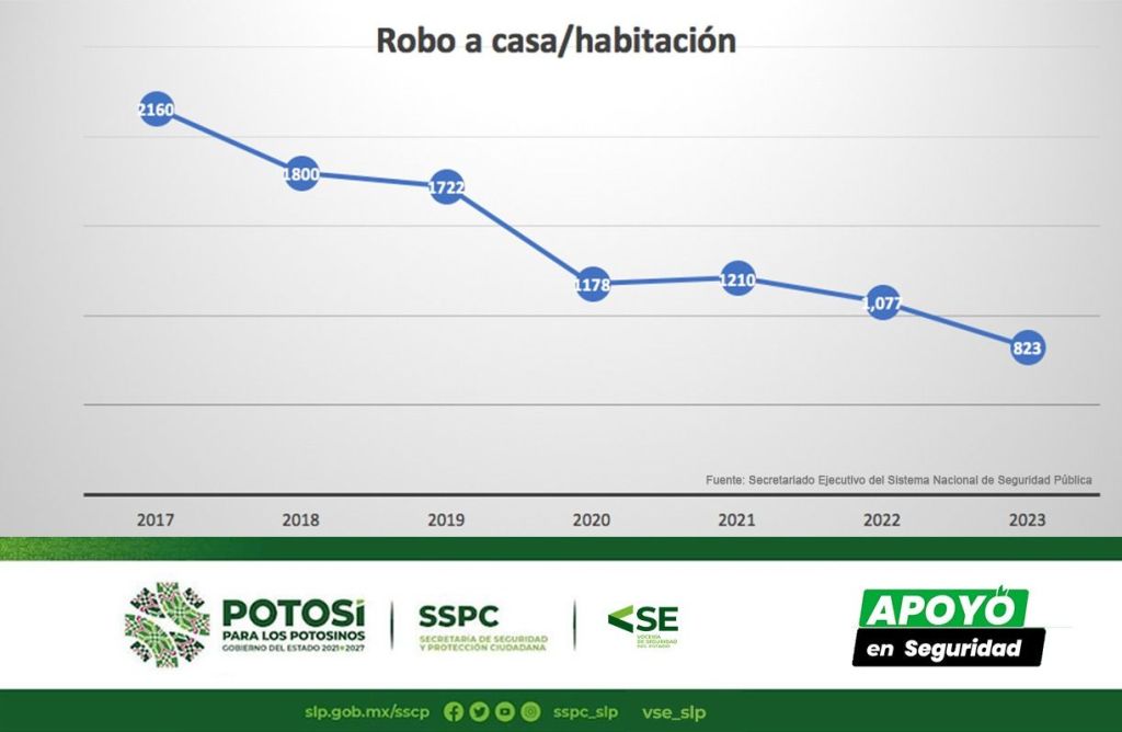 Con acciones y operativos altamente efectivos en apoyo a la tranquilidad y paz en territorio potosino, el Gobierno del Estado mantiene a San Luis Potosí por debajo de la media a nivel nacional en incidencia delictiva y durante 2023 delitos de alto impacto como homicidio doloso, feminicidio, secuestro, robo a casa habitación y robo de vehículos de cuatro ruedas, alcanzaron la cifra más baja de los últimos seis años.