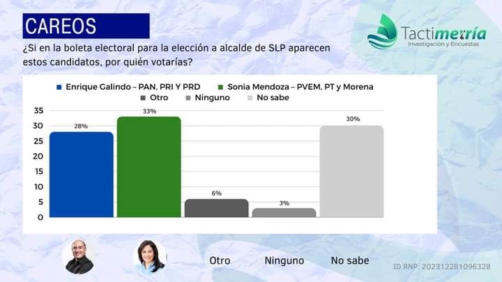 En un segundo careo, al preguntar a los encuestados sobre por quién votarían si en la boleta para la Alcaldía aparecen los nombres de Sonia Mendoza Díaz y Enrique Galindo Ceballos, la preferencia sigue siendo para la precandidata del PVEM con 33%, por un 28% del actual alcalde que será el abanderado de la coalición opositora.