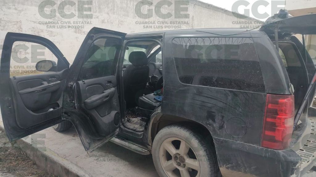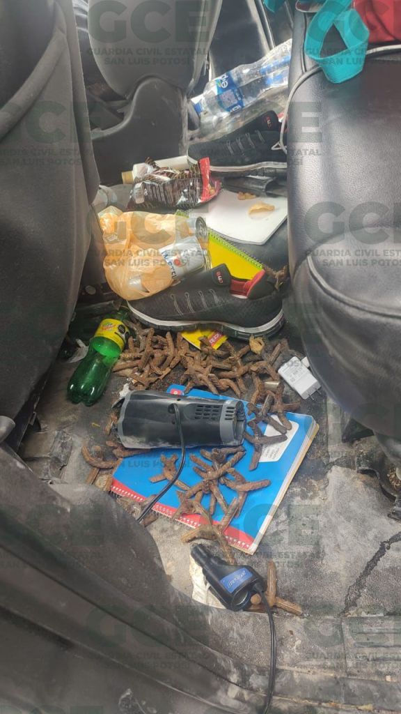 Matehuala, San Luis Potosí.- A través de un operativo aéreo planeado e implementado por agentes de Guardia Civil Estatal, se informa el aseguramiento de una camioneta en cuyo interior se descubrieron tres artefactos explosivos, dos de ellos granadas calibre 40 milímetros y un explosivo confeccionado para detonar a distancia y provocar daños severos, así como objetos denominados como “poncha llantas”.