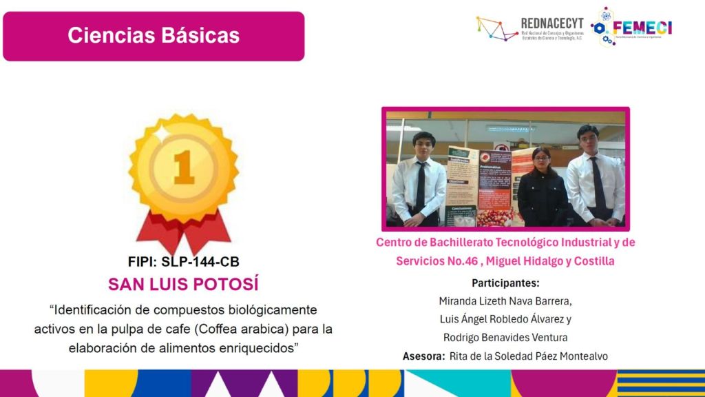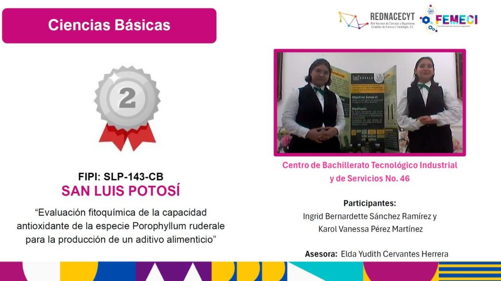 Rosalba Medina Rivera, directora del Copocyt y también presidenta de la Red Nacional de Consejo y Organismos Estatales de Ciencia y Tecnología (Rednacecyt), organismo que coordina la Femeci, informó que los proyectos ganadores del primer y segundo lugar en el área de ciencias básicas corresponden al Centro de Bachillerato Tecnológico Industrial y de Servicios (Cbtis), número 46 de Ciudad Valles.