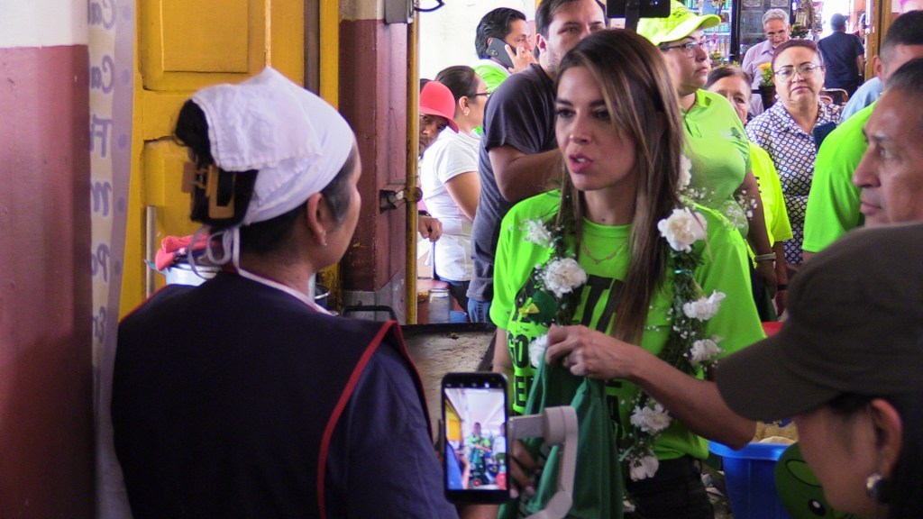 Ruth González Silva caminando y recorriendo y saludando a los locatarios la gente la recibía con insignias, y le pedían fotografías y le externaron sus propuestas para tener mejores instalaciones dignas, ya que el Mercado Hidalgo es patrimonio histórico de la ciudad y genera impulso a la economía de las familias potosinas