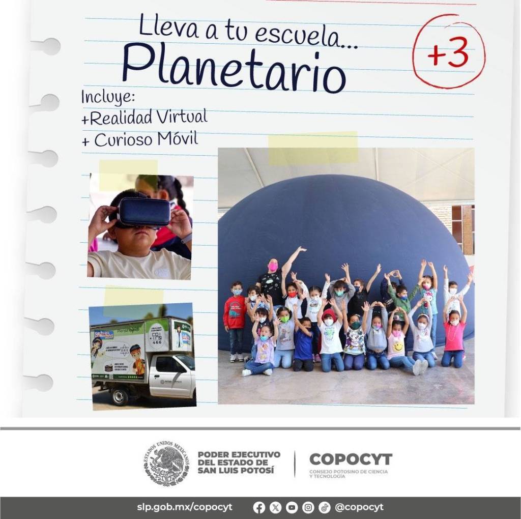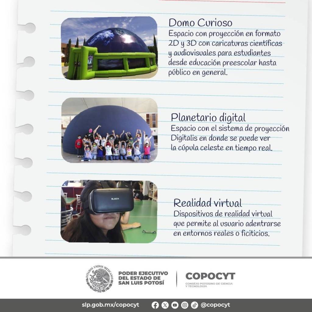 El Copocyt, detalló que Ciencia en tu Escuela, consiste en dos espacios y una actividad: el primero, es el Domo Curioso, un cine móvil que proyecta en formato 2D y 3D con caricaturas científicas y audiovisuales para educación preescolar hasta personas adultas, con capacidad de instalar hasta 100 alumnos y alumnas por función.