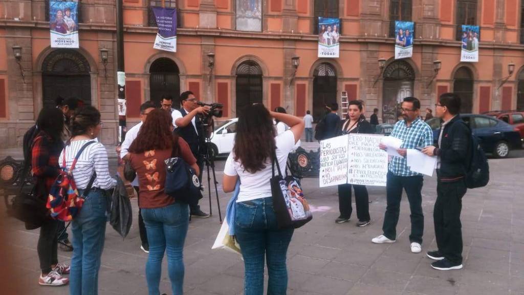 El gremio de periodistas potosinos realizaron una manifestación pacífica en Plaza de fundadores para demandar la presencia con vida sano y salvo del compañero Jaime Barrera privado de su libertad el día de ayer pasado el mediodía Jalisco.