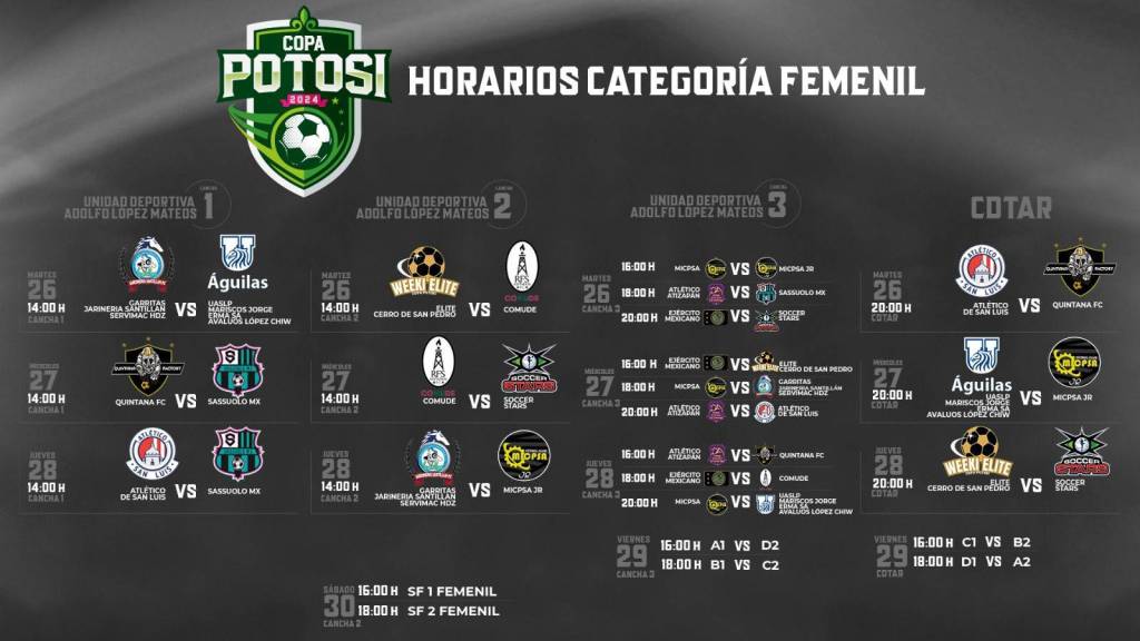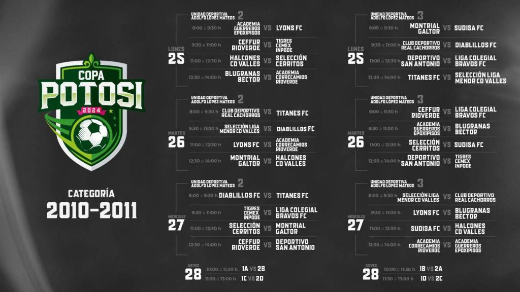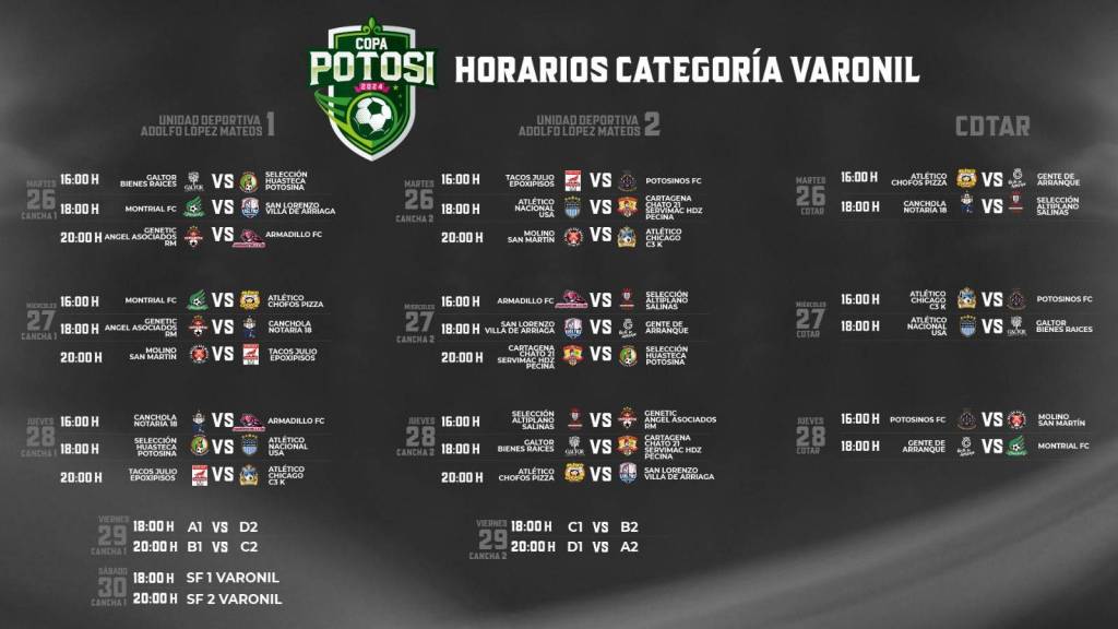 Con una expectativa de más de 40 mil aficionados de todas partes de México, además de turistas que visitan a San Luis Potosí durante el periodo vacacional de Semana Santa, el Poder Ejecutivo del Estado, a través del Instituto Potosino de Cultura Física y Deporte (Inpode), presentó el rol de juegos y horarios de los partidos de la Copa Potosí 2024, que se realizará del 25 al 31 de marzo con una premiación superior a un millón 600 mil pesos.