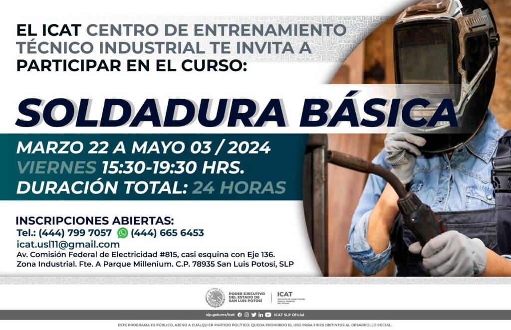 Para abrir más oportunidades de autoempleo a las y los potosinos, el Poder Ejecutivo del Estado, a través del Instituto de Capacitación para el Trabajo (Icat), ofrecerá los cursos “Electricidad Residencial” y “Soldadura Básica”, que comenzarán el 22 y 23 de marzo de 2024, con accesibles precios.
