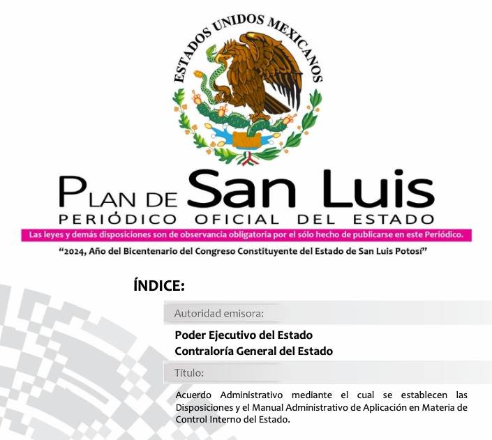 La Contraloría informó que para esta modernización se realizó una actualización del Acuerdo Administrativo mediante el cual se establecen las disposiciones y el Manual Administrativo de Aplicación en Materia de Control Interno del Estado, el cual fue publicado en el Periódico Oficial del Estado de San Luis Potosí.