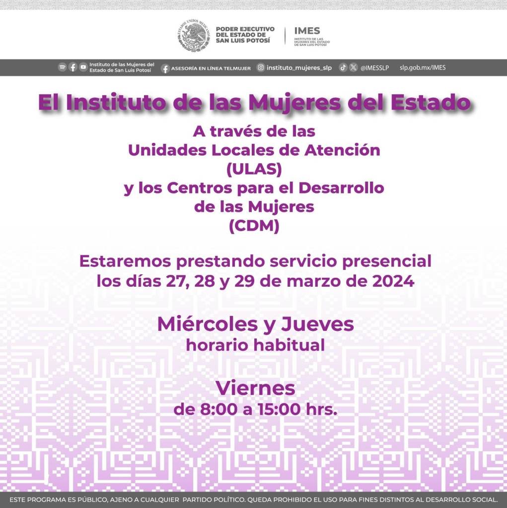 El Poder Ejecutivo del Estado, informó que el Instituto de las Mujeres (Imes) mantendrá su atención a las potosinas en las cuatro regiones durante el periodo de Semana Santa, a través de 12 Unidades Locales de Atención para las Mujeres (ULAS) 14 Centros de Desarrollo para las Mujeres (CDM) y sus oficinas centrales, en la capital potosina.