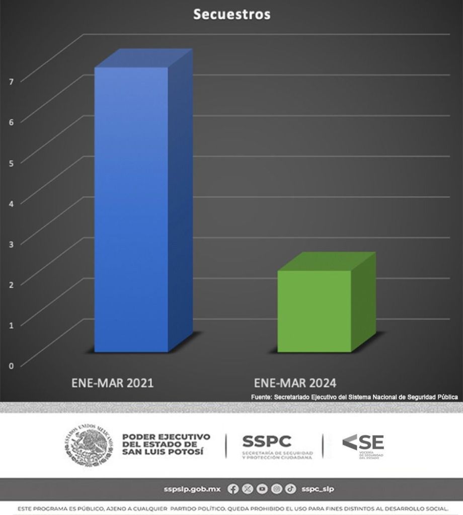 Atendiendo el compromiso del Ejecutivo Estatal de San Luis Potosí de erradicar los delitos del fuero común en la Entidad, durante el primer trimestre del 2024 se registró un descenso significativo en el delito de secuestro en comparativa con la anterior administración estatal, detalló la Vocería de Seguridad del Estado (VSE).
