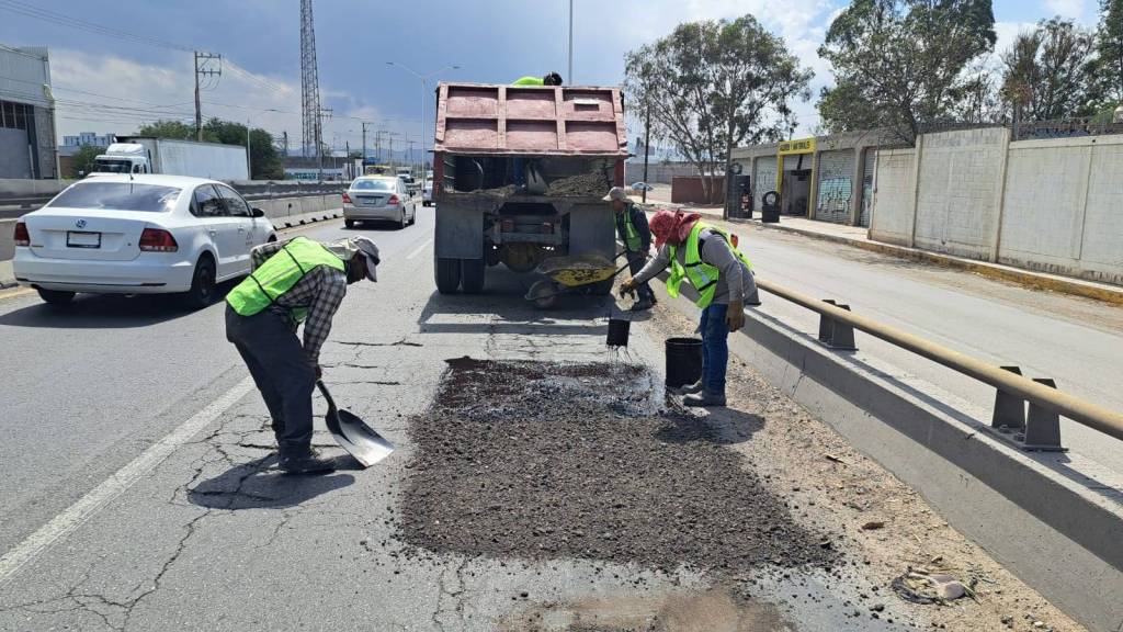 Los trabajos de limpieza y bacheo en el Circuito Potosí son en ambos sentidos de esta ruta donde circula tráfico pesado que transporta bienes e insumos, además de las y los miles de potosinos que se dirigen a sus lugares de trabajo.