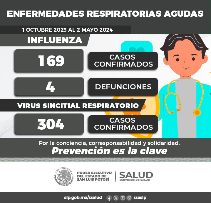 De octubre 2023 inicio de la temporada invernal a mayo 02 del 2024, se tienen registrados 169 casos y cuatro defunciones de influenza en el Estado, mientras que en el mismo periodo de tiempo se han confirmado un total de 304 casos de virus sincitial respiratorio, sin nuevos casos reportados en ambos padecimientos en este corte semanal.