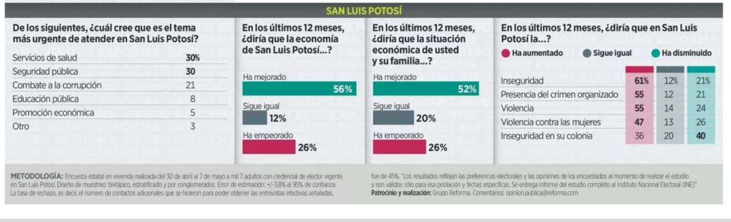 La encuesta reveló que el 56 por ciento de la ciudadanía considera que en los últimos 12 meses la economía de San Luis Potosí ha mejorado, mientras que el 52 por ciento, sintió que la situación económica personal y de las familias también mejoró, muestra de que los programas sociales impulsados por la administración, como becas alimentarias, escolares y programas de ayuda social, han tenido un impacto muy favorable en las familias potosinas.