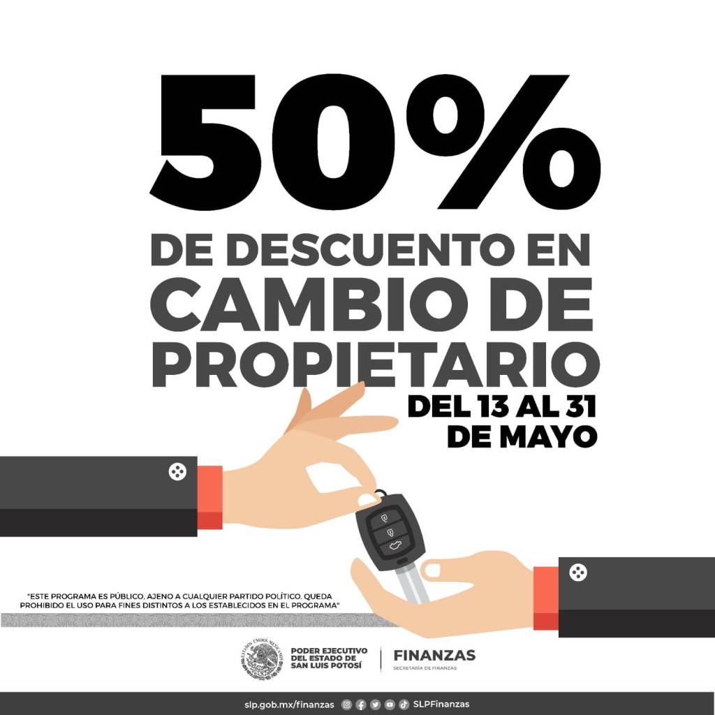 El trámite de cambio de propietario tendrá un descuento del 50 por ciento directamente en las oficinas recaudadoras. Los requisitos para la realización de este trámite son: Factura original, identificación oficial vigente (INE o Pasaporte), comprobante de domicilio: agua, luz, teléfono, internet, cable, predial, gas no mayor a tres meses de antigüedad, tarjeta de circulación, ambas placas metálicas, formato de alta para registro vehicular con los datos y firmas requeridas. Para mayor detalle sobre los requisitos se puede consultar la página oficial: https://slp.gob.mx/finanzas