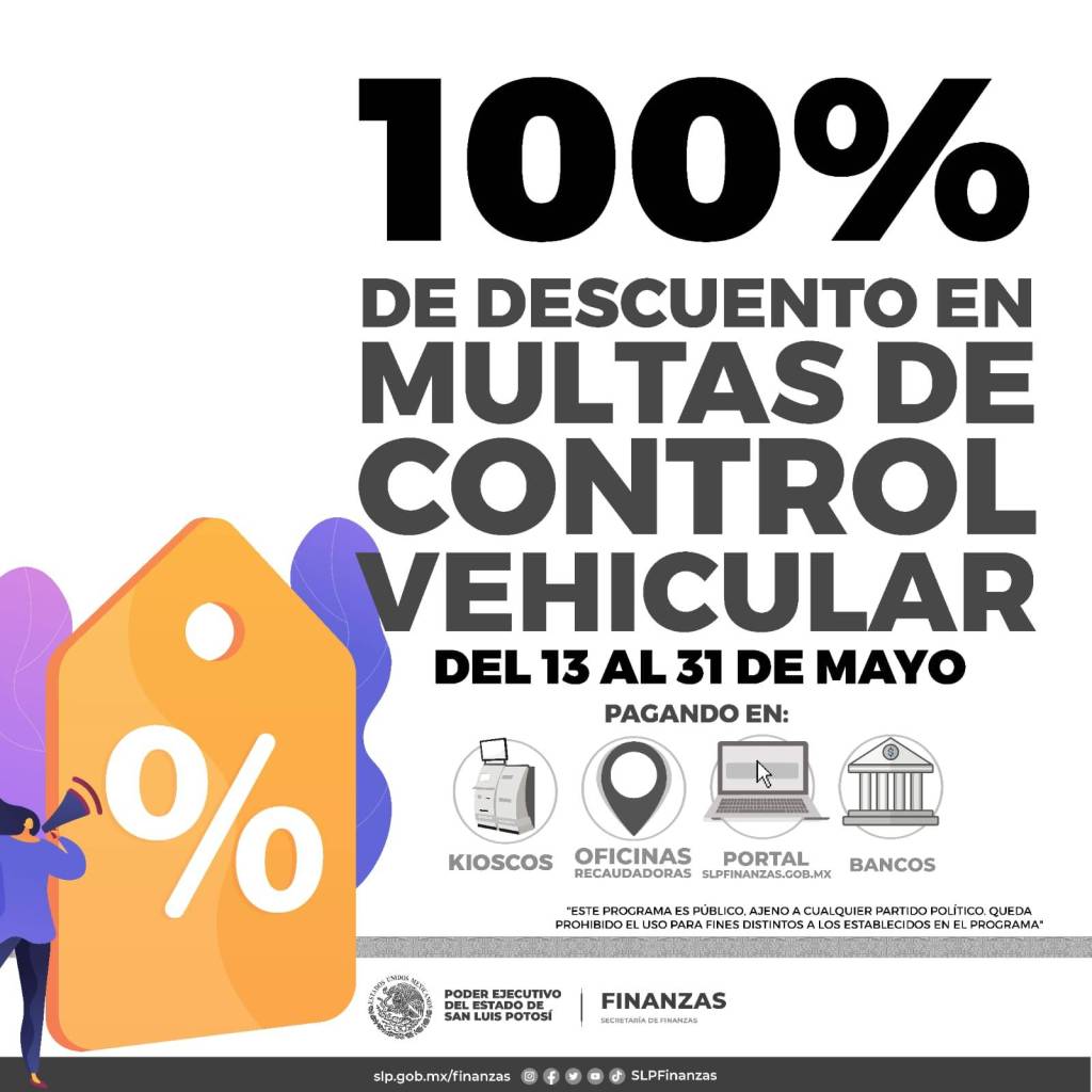 El Poder Ejecutivo del Estado a través de la Secretaría de Finanzas (Sefin) anunció que del 13 al 31 de mayo aplicará descuentos en multas de control vehicular y en cambio de propietario, con el objetivo de que la ciudadanía aproveche el beneficio para ponerse al corriente y acceda al programa de placas gratuitas.