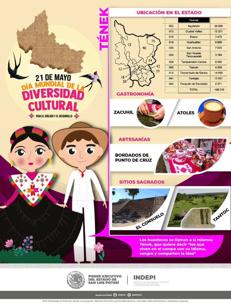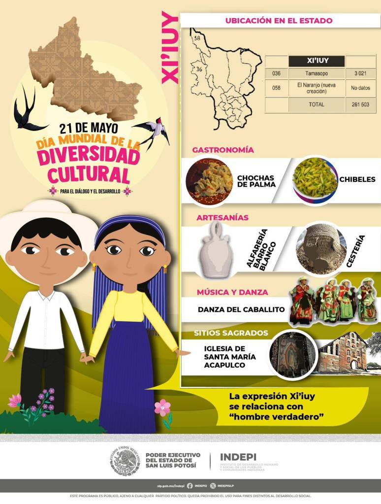 El Poder Ejecutivo del Estado, a través del Instituto de Desarrollo Humano y Social de los Pueblos y Comunidades Indígenas del Estado (Indepi) reconoce la importante diversidad cultural de San Luis Potosí, sustentada en la presencia histórica y vigente en su territorio de los pueblos originarios Náhuatl, Tének y Xi’iuy, así como la presencia regular de los Wixarika.