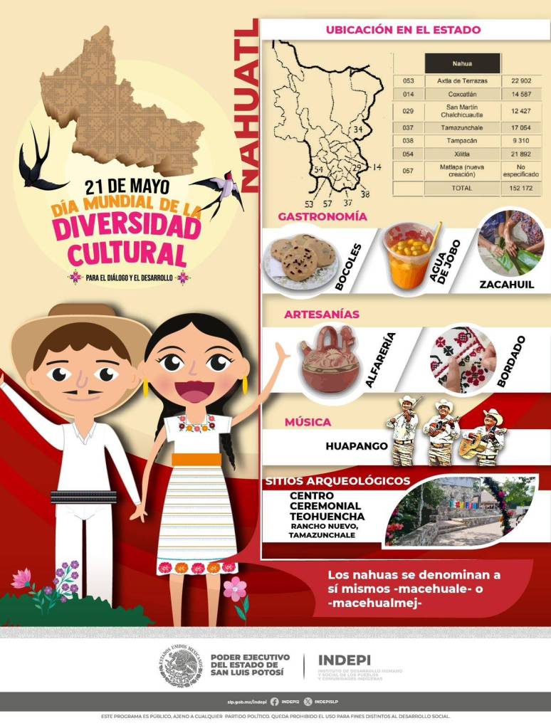 La dependencia estatal informó que esta fecha es la oportunidad para sensibilizar a la ciudadanía y a los Gobiernos a superar las diferencias y divisiones entre culturas e impulsar el diálogo y respeto de forma equitativa e intercultural en el que se garantice el cumplimiento de los derechos culturales de las personas, los pueblos y las comunidades indígenas de San Luis Potosí, así como con aquellos pueblos que han migrado al Estado, tal es el caso de los Mazahua, Triqui, Mixteco, Otomí, por mencionar algunos.