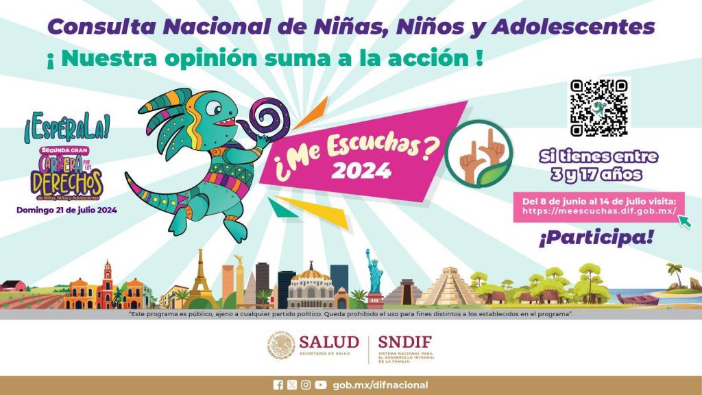 La Consulta Nacional de Niñas, Niños y Adolescentes ¿Me escuchas? 2024, ¡Nuestra opinión, suma a la acción!, está dirigida a menores de tres a 17 años, población mexicana que radica en nuestro país o en cualquier otra parte del mundo, así como a niñas, niños y adolescentes que se encuentren en movilidad humana por México, por lo que invitaron a visitar el sitio web: https://meescuchas.dif.gob.mx.