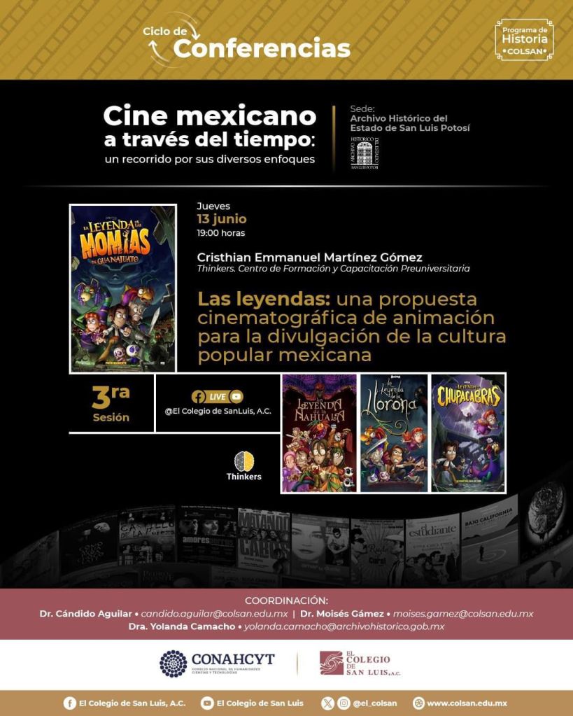 El siguiente evento se llevará a cabo en las instalaciones del Archivo Histórico, el jueves 13 de junio, en punto de las 19:00 horas, en donde Cristhian Emmanuel Martínez Gómez impartirá “Las leyendas: una propuesta cinematográfica de animación para la divulgación de la cultura popular mexicana”, como parte del ciclo “Cine mexicano a través del tiempo: un recorrido por sus diversos enfoques”, en colaboración con El Colegio de San Luis.