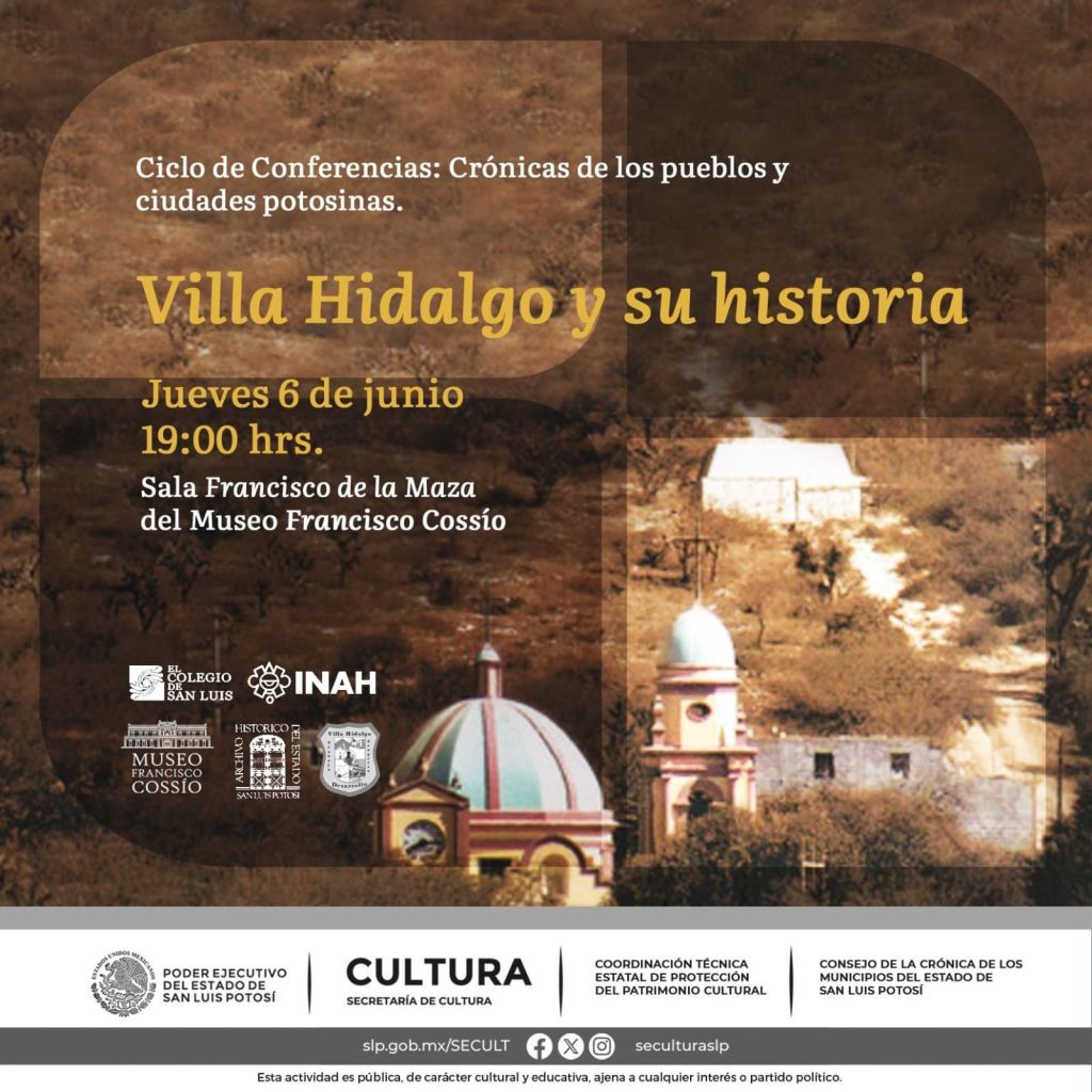 La dependencia refirió que el jueves 6 de junio, se realizará la conferencia “Villa Hidalgo y su Historia”, en el Museo Francisco Cossío, a las 19:00 horas que forma parte del ciclo “Crónicas de los pueblos y ciudades potosinas”, en colaboración con la Secretaría de Cultura (Secult), a través de la Coordinación de Protección del Patrimonio Cultural y el Consejo de la Crónica de los Municipios, el Colegio de San Luis y el Instituto Nacional de Antropología e Historia.
