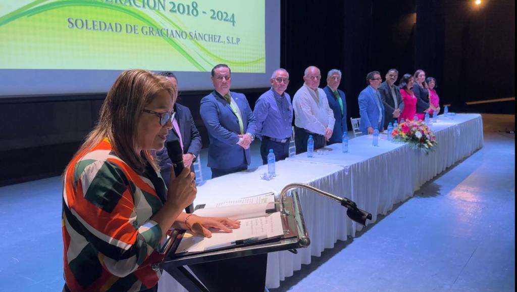 En una emotiva ceremonia realizada en el Teatro y Centro Cultural «Doroteo Arango», la Alcaldesa Interina de Soledad de Graciano Sánchez, Araceli Martínez Pérez, presidió la ceremonia de clausura del ciclo escolar 2023-2024, y de graduación de alumnas y alumnos de la generación 2018-2024 de la escuela Primaria «Héroes de Nacozari» de la colonia Hogares Ferrocarrileros Primera Sección.