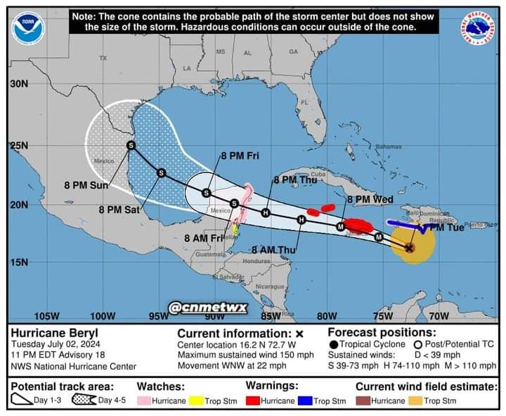 En la trayectoria pronosticada, el centro de Beryl se moverá rápidamente a través del Mar Caribe central esta noche y se pronostica que pasará cerca o sobre Jamaica el miércoles.