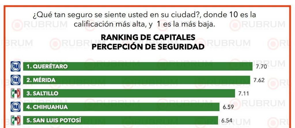 Por lo que respecta a Servicios Públicos, San Luis Potosí alcanzó la tercera posición, con 7.00 puntos; mientras que en la percepción de seguridad, la Capital de San Luis Potosí se ubicó en la quinta posición entre las 31 ciudades capitales, con 6.54 puntos.