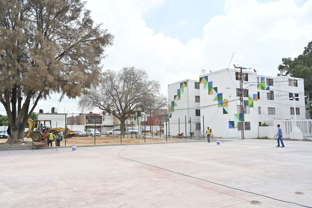 El proyecto incluye la rehabilitación de más de 250 metros cuadrados de pavimentos peatonales y guarniciones, concreto estampado en plaza pública, desazolve de drenaje, instalación de juegos infantiles y aparatos de ejercicio, rehabilitación de pintura de edificios y alumbrado público de la plaza.