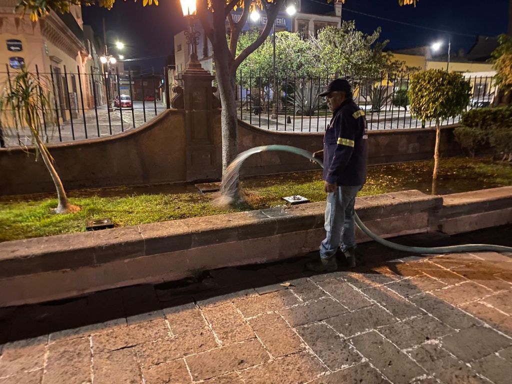 La Dirección de Servicios Municipales informó que personal de la Coordinación de Parques y Jardines trabajó en la limpieza del área y de la fuente en la Plaza Aranzazú, uno de los sitios más representativos de la Capital, por su belleza arquitectónica y su ubicación cercana a los edificios históricos del primer cuadro.