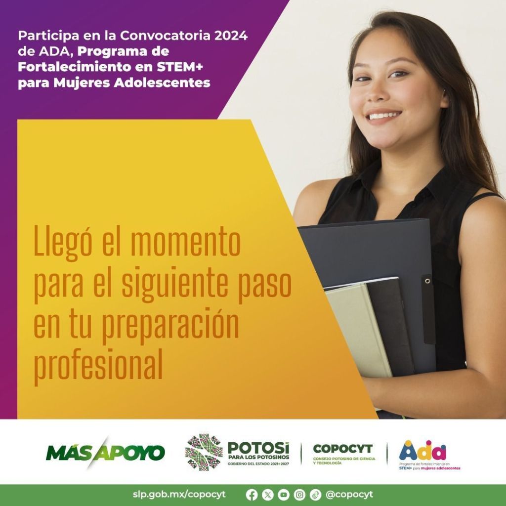 El Consejo Potosino de Ciencia y Tecnología (Copocyt), invita a estudiantes de bachillerato, de instituciones públicas y privadas a participar en ADA, programa de fortalecimiento en Ciencias, Tecnología, Ingeniería, Matemáticas, Humanidades y Artes (STEM+) para mujeres adolescentes, extracurricular y gratuito.