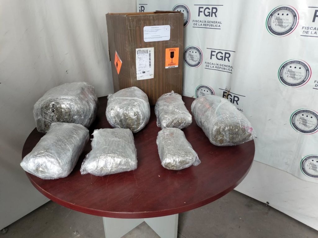 Para corroborar el hallazgo, el envío fue ingresado a una máquina de rayos X, donde se confirmó la presencia de material orgánico en su interior; al abrir la caja se localizaron siete envoltorios de plástico de distintas dimensiones, los cuales contenían hierba verde y seca con las características propias de la marihuana, con peso aproximado de 8.1 kilos.