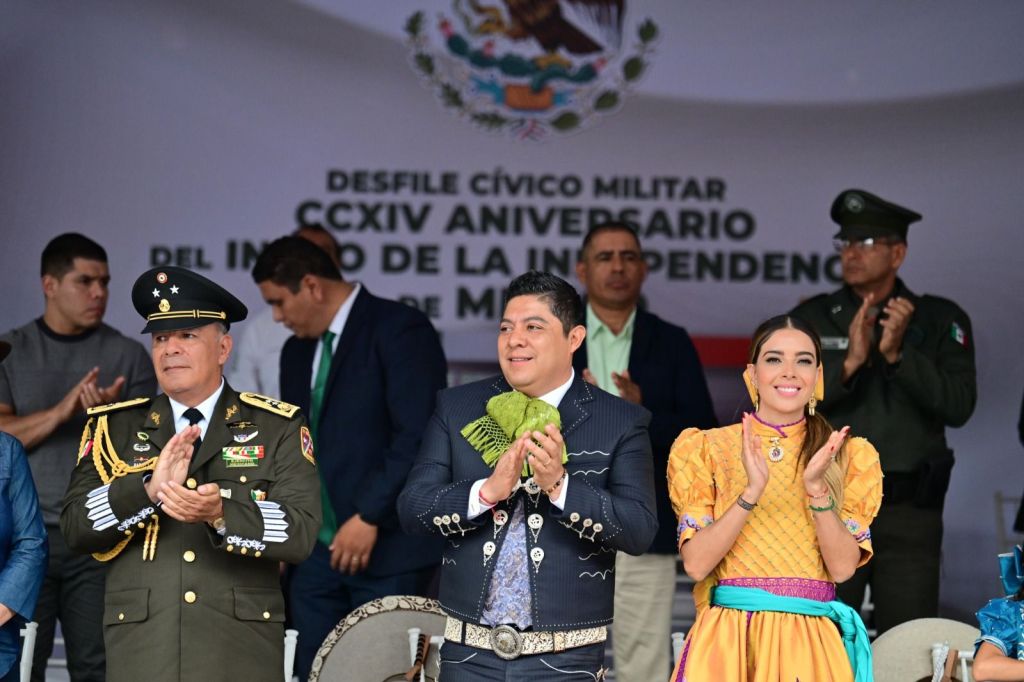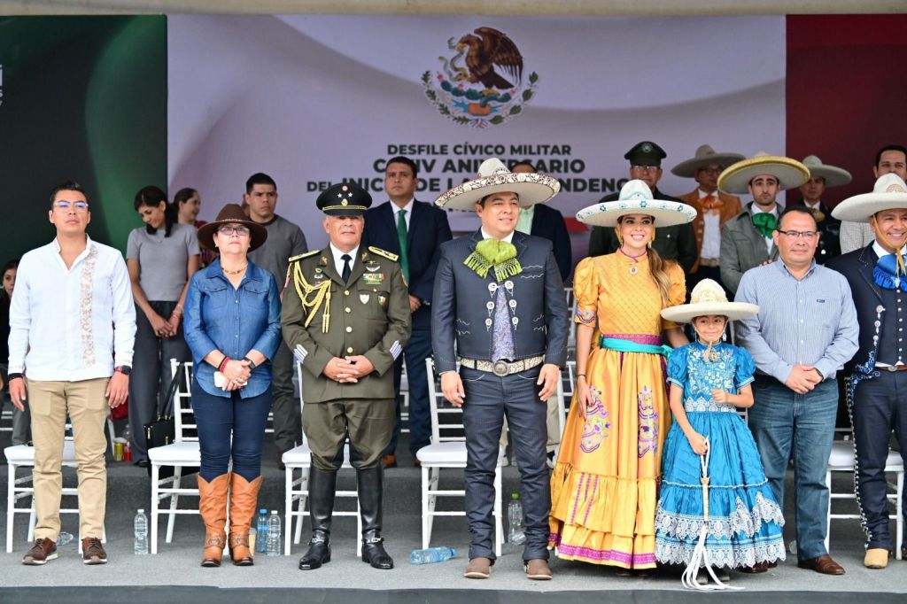 Vestido de charro y montando a caballo el Mandatario Estatal, junto a la Senadora de la República Ruth González Silva, quien portó un vestido de dama charra, inició el recorrido desde la calle Uresti, donde saludo a las familias completas que cargadas de patriotismo y orgullo nacional acudieron a disfrutar de este tradicional desfile.