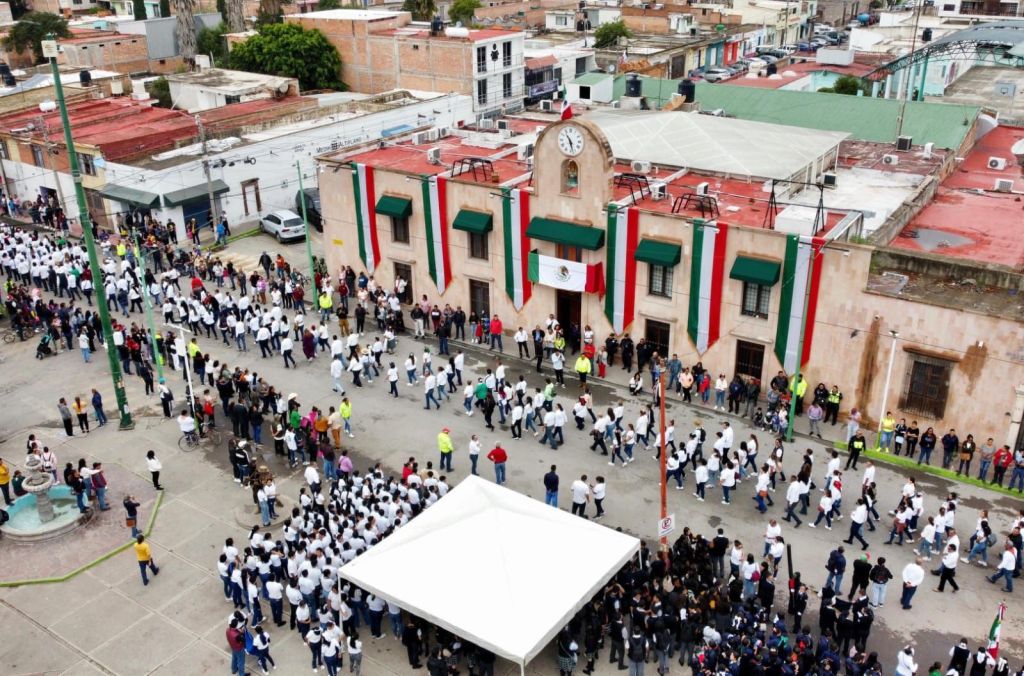 La ceremonia, llevada a cabo en el Jardín Principal del municipio, inició con los honores a la bandera, en los que participaron la escolta y la banda de guerra de la Escuela Secundaria «Graciano Sánchez Romo», integradas por alumnas y alumnos de la institución.