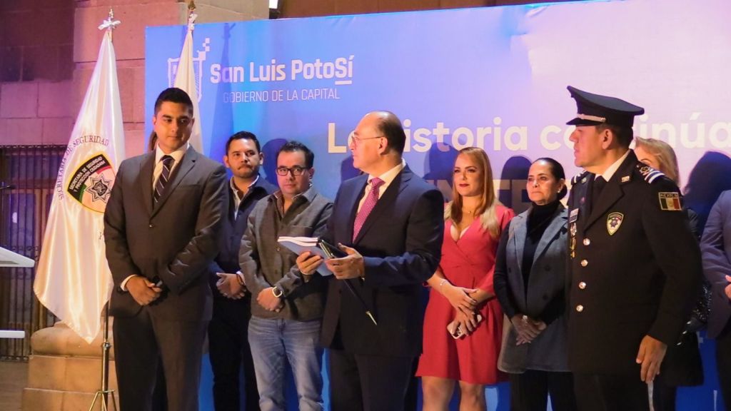El alcalde Enrrique Galindo entregó el bastón de mando al Comisario Juan Antonio Villa Gutierrez para que está gran corporación siga siendo el orgullo de los potosinos al mismo tiempo entrego la Constitución para que se cumpla cabalmente y se cumpla.