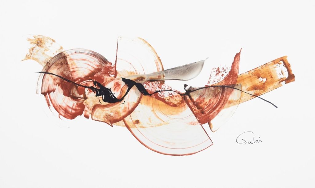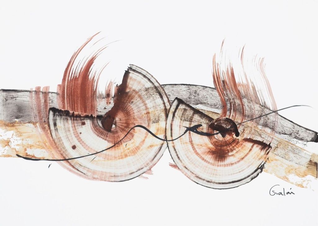 - Huellas del espacio integra piezas abstractas realizadas con tinta china, arcilla, y óxidos sobre papel.
