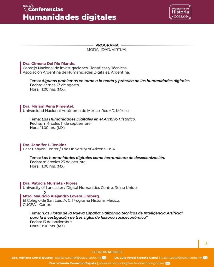 La próxima charla dentro del ciclo será “Las humanidades digitales como herramienta descolonización”, que impartirá Jennifer L. Jenkins de The University of Arizona, y será transmitida el 23 de octubre de 2024, a las 11:00 horas, a través de la página de Facebook https://www.facebook.com/archivohistoricoslp/.